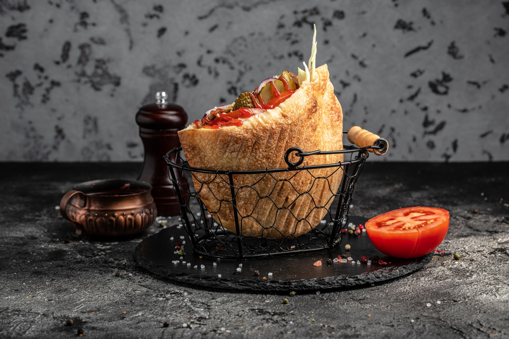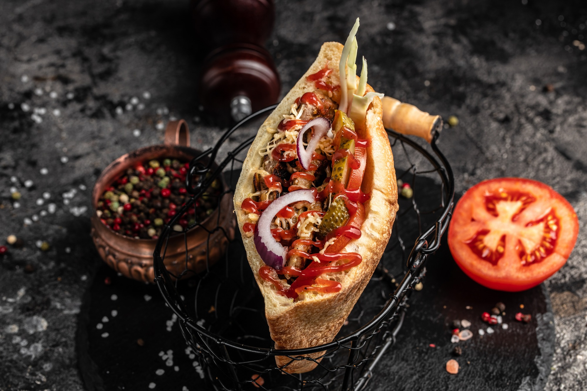 bułka, surówka, mięso, sos -