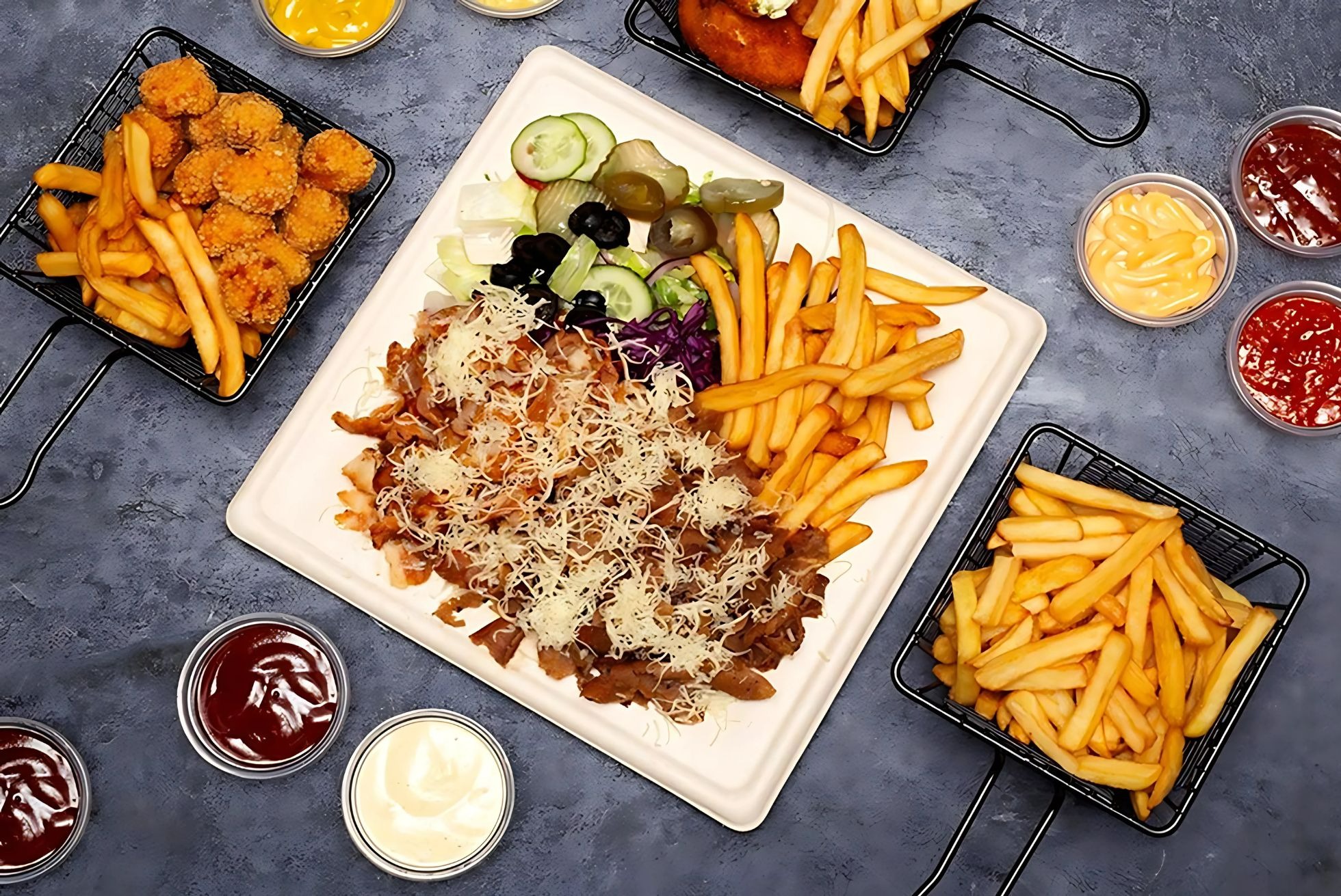 mięso, ser tarty, mix sałat, sos, frytki -
